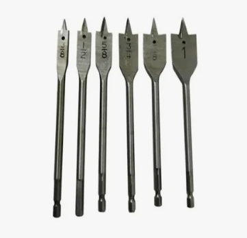 - El juego de brocas espada (también conocidas como brocas planas o de pala) está diseñado para realizar perforaciones rápidas y limpias en madera. Estas brocas cuentan con un diseño plano con una punta centradora afilada y filos laterales que permiten una rápida extracción del material.