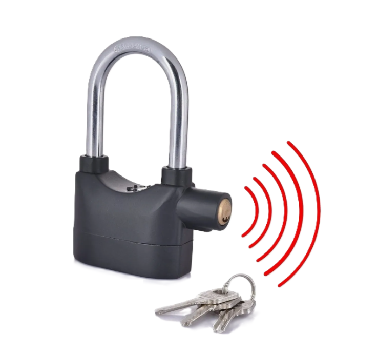 Candado de alta seguridad para motocicleta con sistema de alarma integrado, que combina resistencia física y protección sonora contra intentos de robo. Su diseño con aro facilita la fijación y asegura mayor estabilidad.