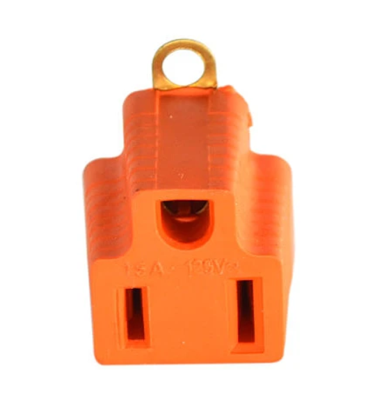 Adaptador práctico que permite conectar equipos con enchufe de 3 patas a tomas de 2 entradas. Su diseño compacto y color naranja facilita su ubicación y uso en el hogar, oficina o taller.