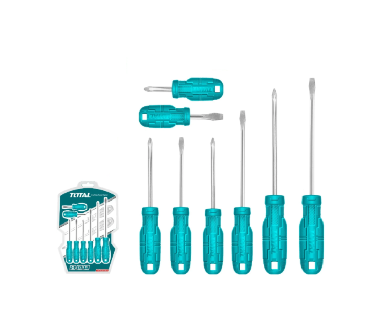Juego de destornilladores de alta resistencia, diseñado para cubrir diferentes necesidades en reparaciones, mantenimiento y trabajos de precisión. Incluye puntas planas y de estrella para mayor versatilidad.