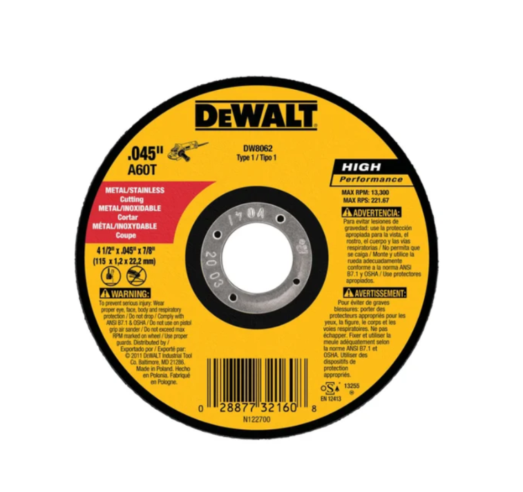 Disco de corte DEWALT 100% original, disponible en medidas de 4.1/2” a 14”, diseñado especialmente para trabajos en metal y materiales ferrosos. Fabricado con granos abrasivos de alta calidad que garantizan corte rápido, limpio y seguro, con una larga vida útil. Ideal para talleres metalmecánicos, herrería y uso en construcción.