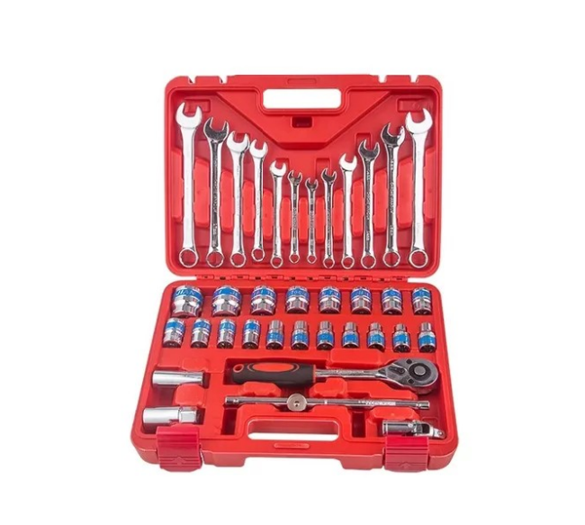 Completo juego de herramientas con rachet, copas y llaves combinadas, diseñado para trabajos mecánicos exigentes y uso profesional.